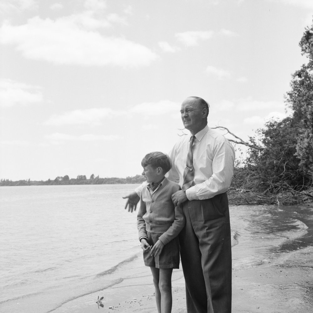 Date12 January 1961Reference NumberPhoto gca-479DescriptionMP George Walsh standing next to water with a boy, January 1961.FormatNegativePhysical Description6x6cm cellulose triacetate black and white negativeSource of AcquisitionGifford-Cross Donation, 1992Photographer/CreatorBay of Plenty Times