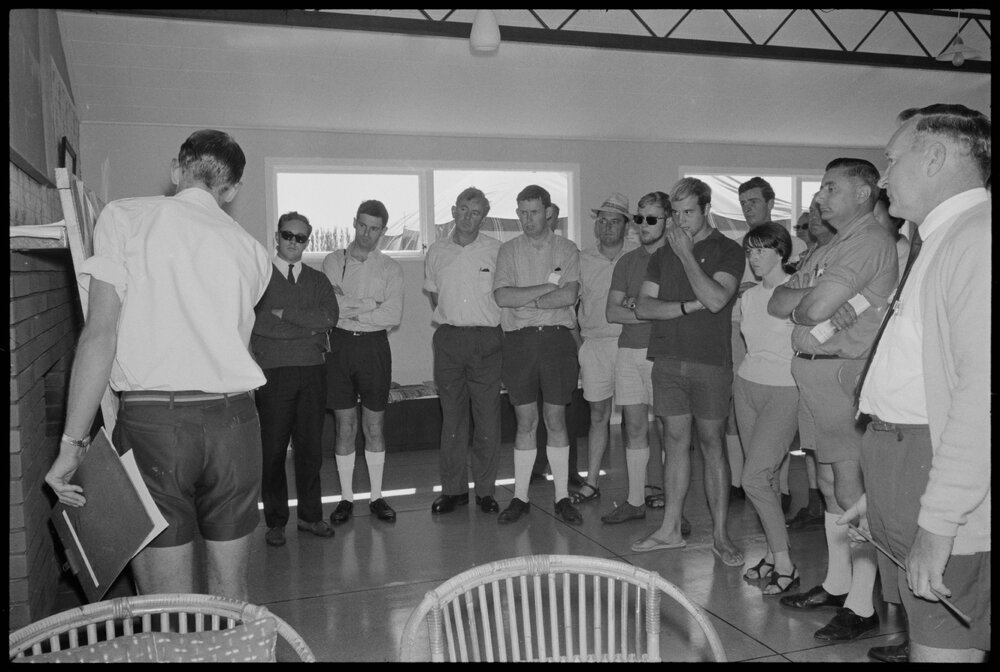 Tauranga Aero Club assistant flying instructor Allan Fletcher (right) explains aerial photograph of Tauranga Airport to pilots during briefings before Royal New Zealand Aero Club's pageant (26 February 1969). Pae Korokī, accessed 25/03/2026, https://paekoroki.tauranga.govt.nz/nodes/view/86905