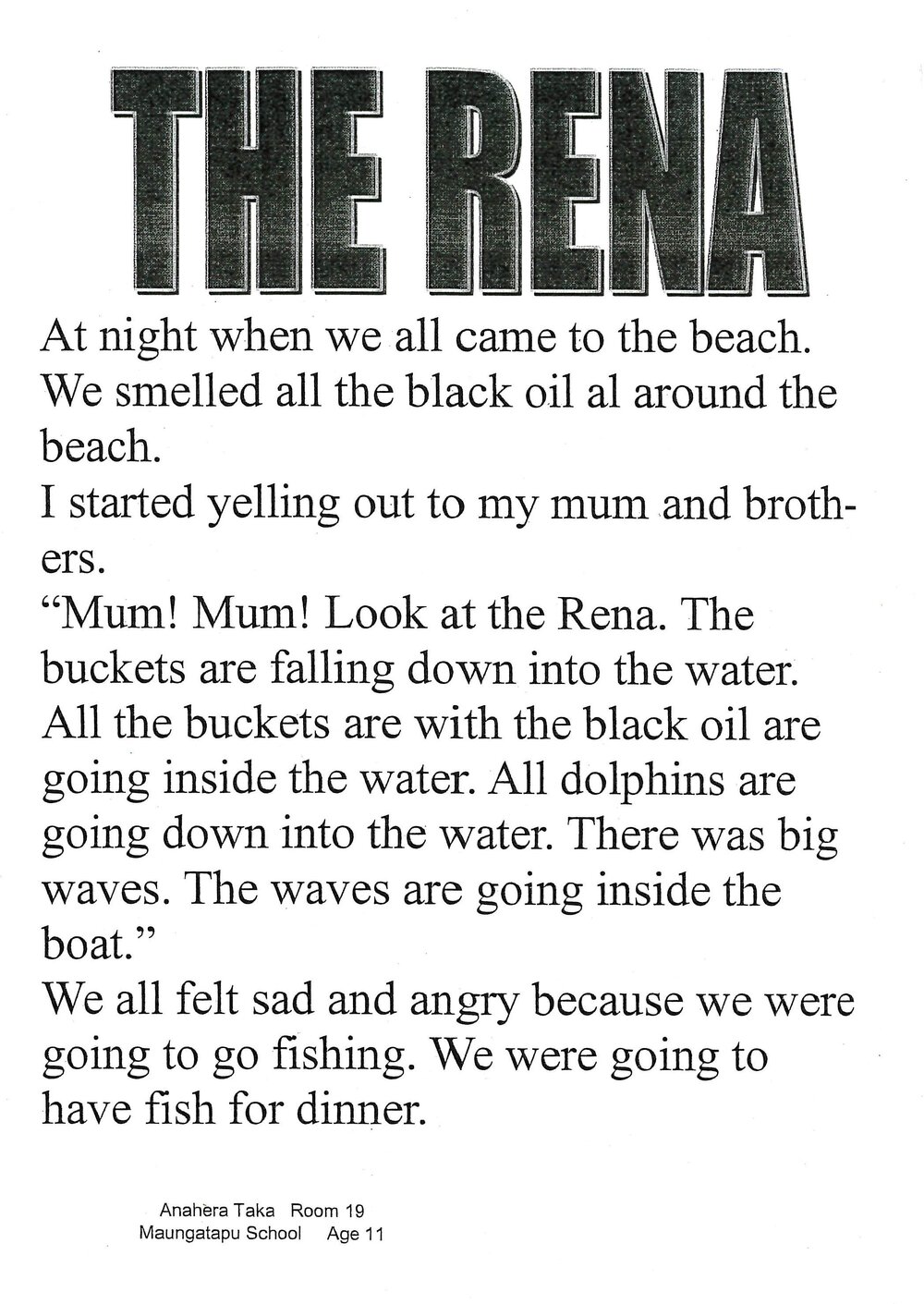 DescriptionIn 2011 Maungatapu School's Room 13 (year's 2 & 3) wrote poetry in reaction to the Rena disaster. The poetry and posters appeared in a window display at Tauranga City Library.
