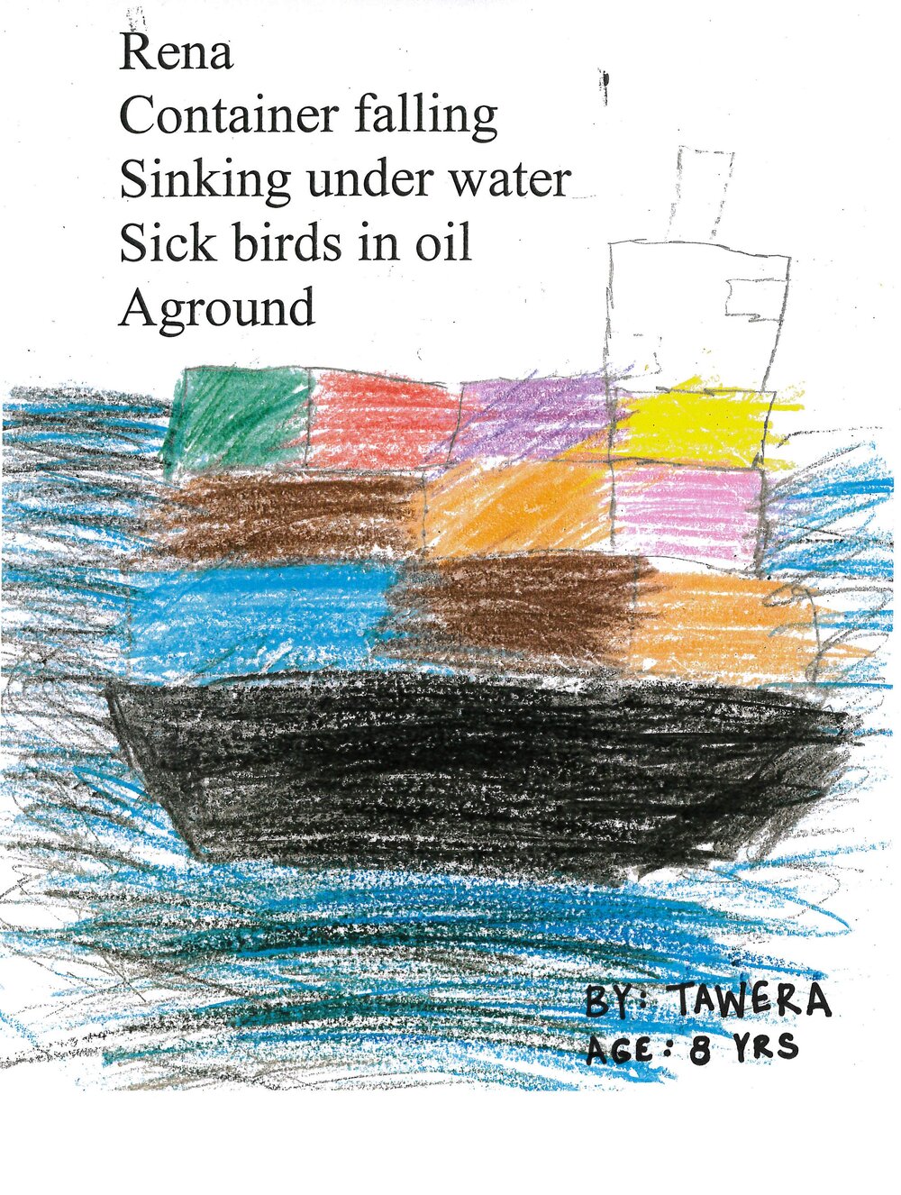 DescriptionIn 2011 Maungatapu School's Room 13 (year's 2 & 3) wrote poetry in reaction to the Rena disaster. The poetry and posters appeared in a window display at Tauranga City Library. This poem and drawing are by Tawera (aged 8).