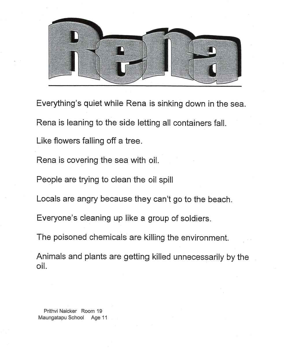DescriptionIn 2011 Maungatapu School's Room 13 (year's 2 & 3) wrote poetry in reaction to the Rena disaster. The poetry and posters appeared in a window display at Tauranga City Library.