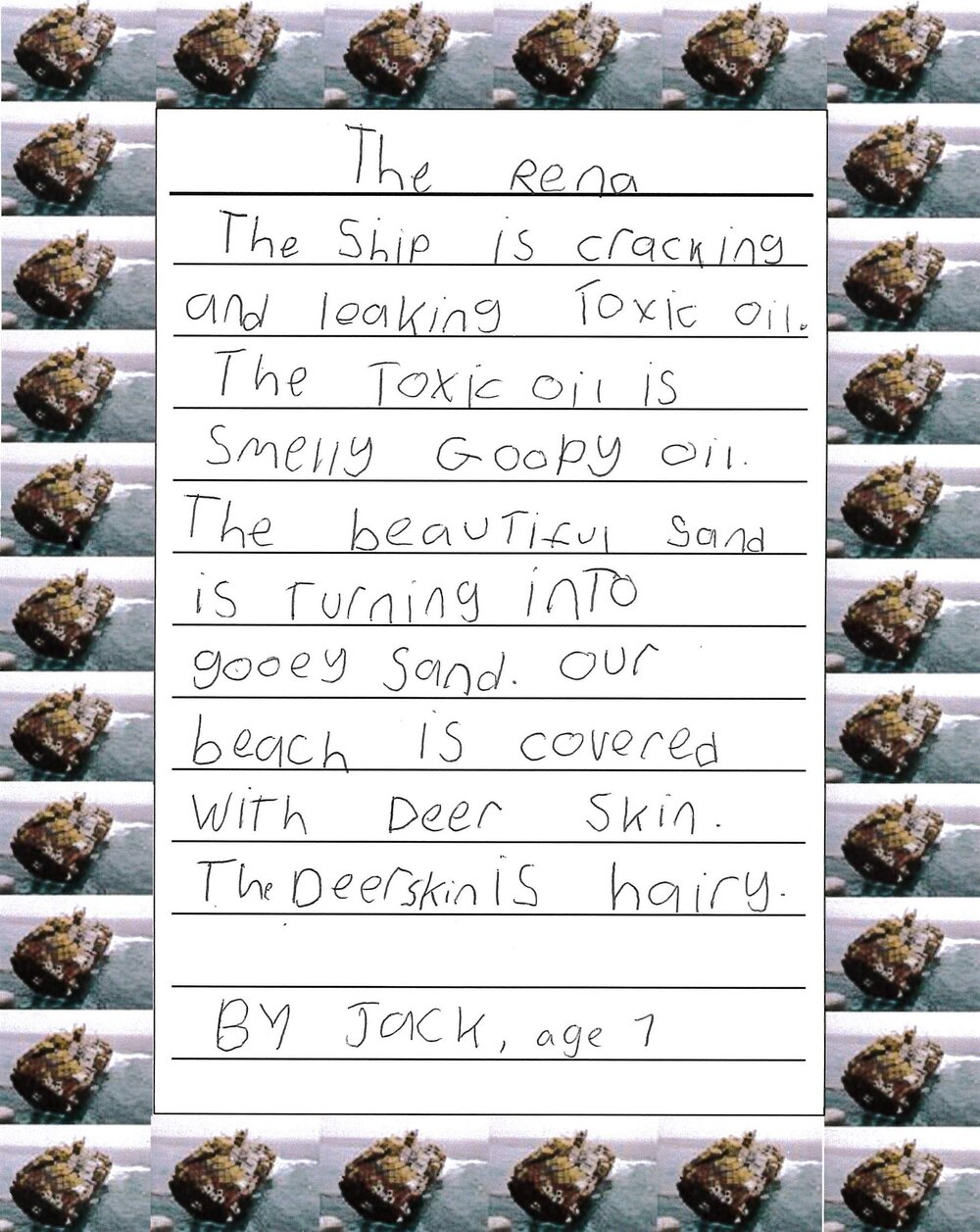 The ship is cracking and leaking toxic oil.The toxic oil is smelly gloopy oil.The beautiful sand is turning into gooey sand. Our beach is covered with deer skin. The deer skin is hairy.