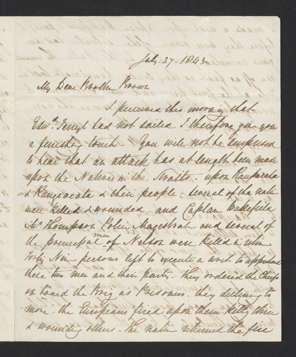 Williams, Henry, 1792-1867, Henry Williams to A.N. Brown, 27 July 1843 (27 July 1843). Pae Korokī, accessed 25/03/2026, https://paekoroki.tauranga.govt.nz/nodes/view/88271