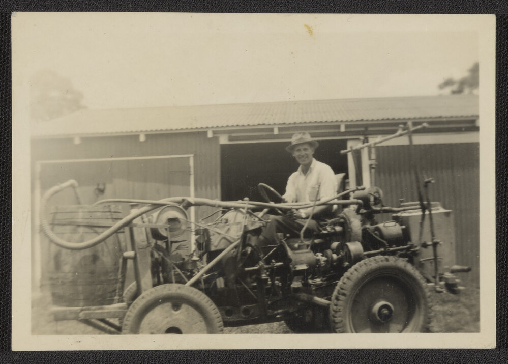 Hewlett, Francis Esme Theodore (1891-1974), Spraying tractor at Maungatapu Vineyard (c.1939-c.1960). Pae Korokī, accessed 25/03/2026, https://paekoroki.tauranga.govt.nz/nodes/view/88347
