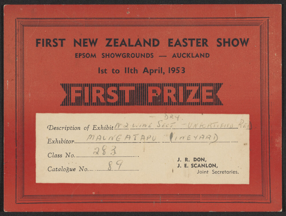 Maungatapu Vineyard, Prize certificate won by Maungatapu Vineyard at the New Zealand Easter Show. (April 1953). Pae Korokī, accessed 25/03/2026, https://paekoroki.tauranga.govt.nz/nodes/view/88351