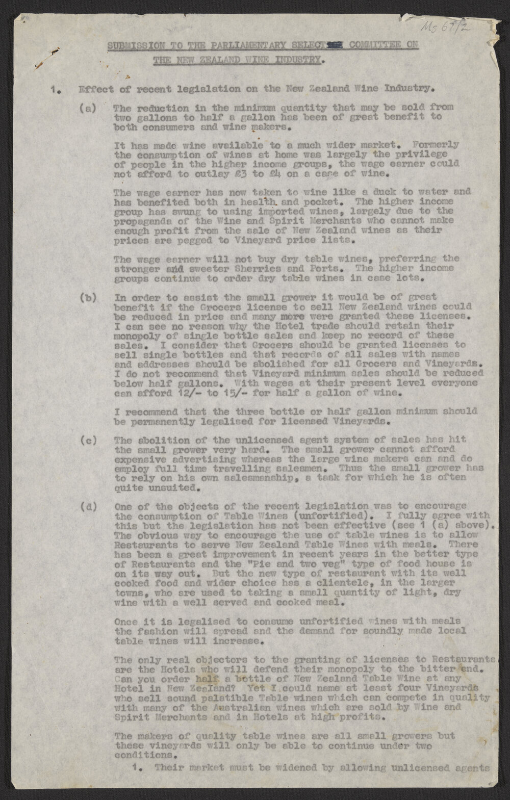 "Submission to the parliamentary select committee on the New Zealand wine industry"