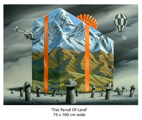 DescriptionTopical, current affairs and cultural expressions sometimes become subject matter for Wellington painter Bruce Luxford. His unusual, beautifully executed painting 'This Parcel of Land' is very topical at a time when land in New Zealand is still being sold to foreign buyers._x000D_