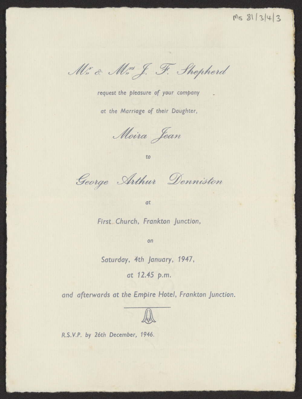 Wedding invitation for Shepherd and Denniston, 1947 (4 January 1947). Pae Korokī, accessed 25/03/2026, https://paekoroki.tauranga.govt.nz/nodes/view/91081