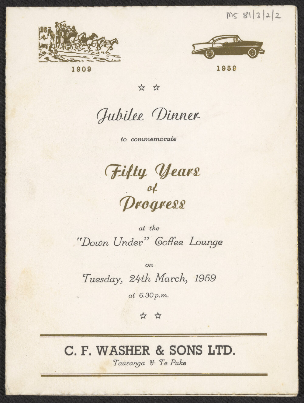 C. F. Washer & Sons Limited, Programme for C. F. Washer & Sons Jubilee Dinner, 1959 (24 March 1959). Pae Korokī, accessed 25/03/2026, https://paekoroki.tauranga.govt.nz/nodes/view/91088