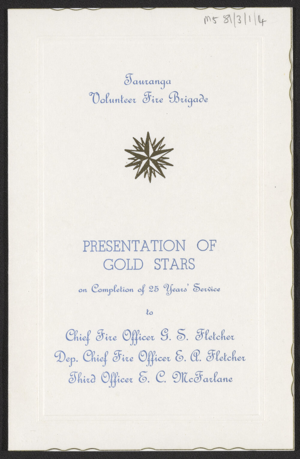 Tauranga Volunteer Fire Brigade, Invitation to the presentation of gold stars, 1962 (10 February 1962). Pae Korokī, accessed 25/03/2026, https://paekoroki.tauranga.govt.nz/nodes/view/91091