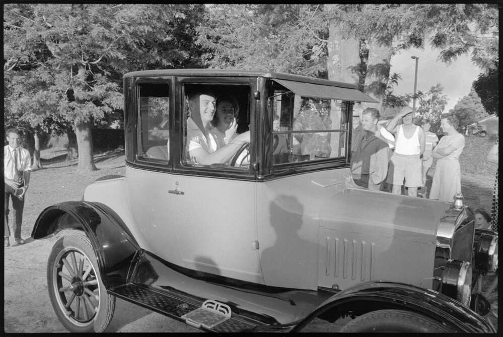 Date16 December 1965Reference Numberphoto gcc-11992DescriptionMr and Mrs Morrison drive in vintage car to Wharepai Domain. Published 16 December 1965Physical Description35mm black-and-white negative (1/2)Photographer/CreatorBay of Plenty Times
