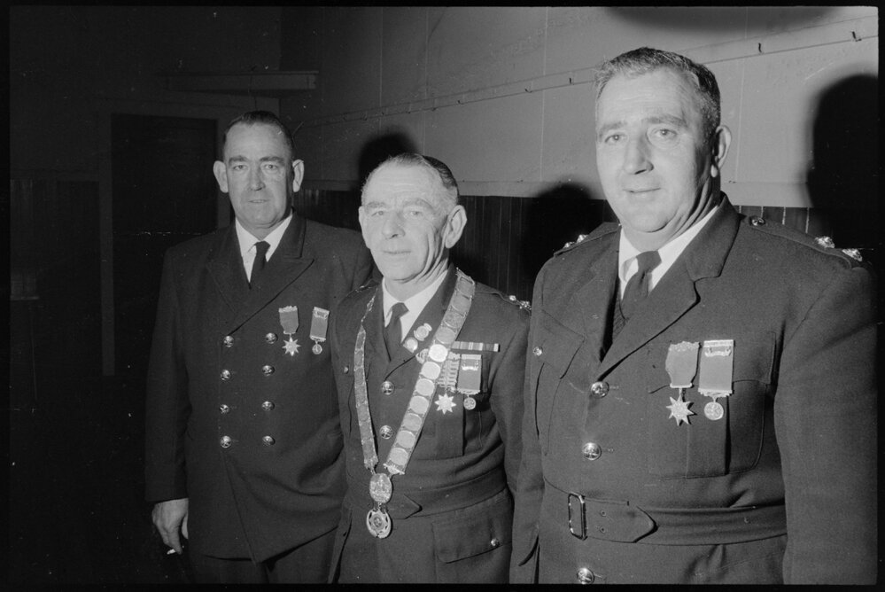 Date25 July 1966Reference NumberPhoto gcc-14983DescriptionFire Brigade Gold Star presentation: Mr G. Barney (left), Mr J. Padlie (right), Mr R.C. Bush. Published 25 July 1966.Physical Description35mm black-and-white negative (1/2)Photographer/CreatorBay of Plenty Times