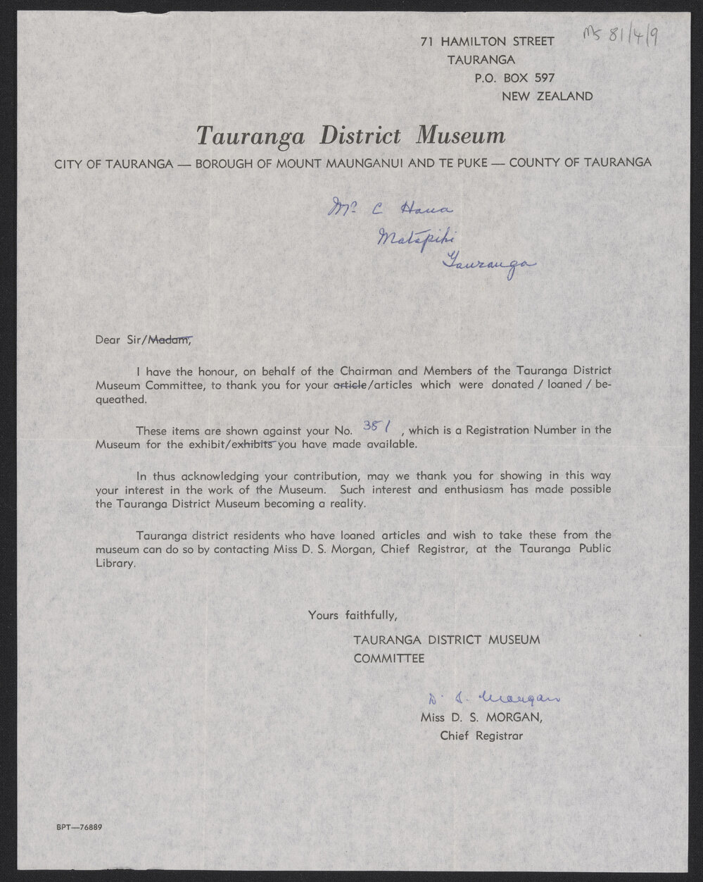 Letter from Tauranga District Museum to Mr C. Haua, undated