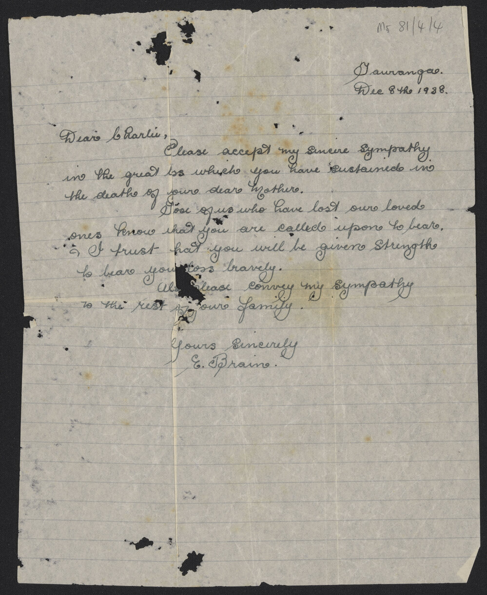 Brain, E., Letter from E. Brain to Charlie [Haua], 8 Dec 1938 (8 December 1938). Pae Korokī, accessed 20/01/2026, https://paekoroki.tauranga.govt.nz/nodes/view/93341