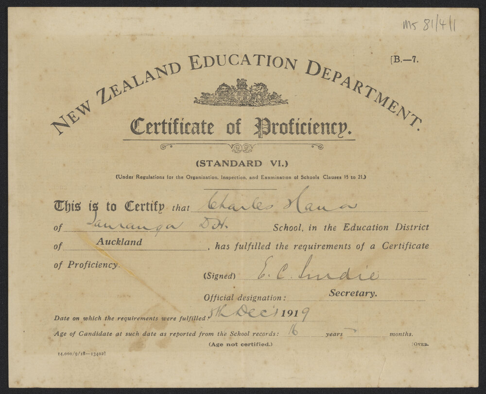 New Zealand. Education Department, Certificate of Proficiency, Charles Haua, Dec 1919 (5 December 1919). Pae Korokī, accessed 25/03/2026, https://paekoroki.tauranga.govt.nz/nodes/view/93345