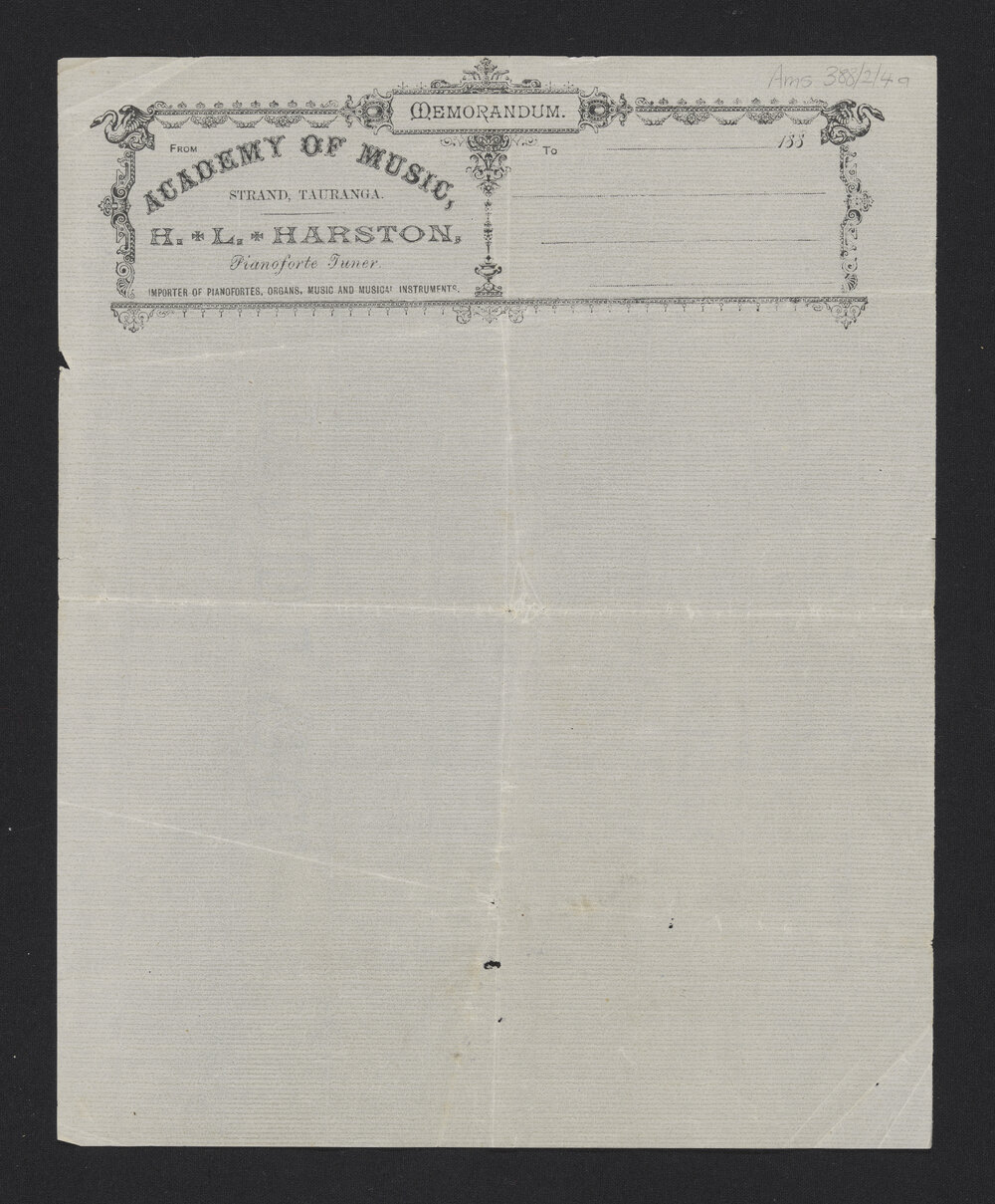 Unknown, Letterhead and bookplate for H L Harston, pianoforte tuner (c. 1886). Pae Korokī, accessed 03/04/2026, https://paekoroki.tauranga.govt.nz/nodes/view/93381