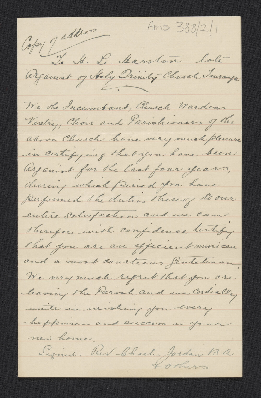 Rev Charles Jordan and others, Reference of Harry Harston (c. 1889). Pae Korokī, accessed 03/04/2026, https://paekoroki.tauranga.govt.nz/nodes/view/93384