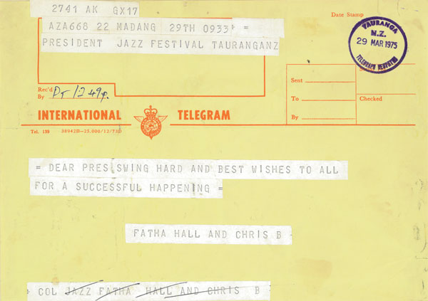 Telegram from Patha Hall and Chris B to Tauranga Jazz Festival Society