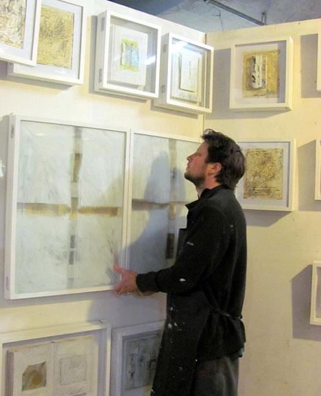 DescriptionThe story behind Kirstian Lomath's 'Book Work' began in 2005/6 while the artist was reclusive and living without electricity in the farming community of Ngakuru, south of Rotorua. A set of encyclopedias, titled 'Pictorial Knowledge', was Kristian”s main form of entertainment and a resource for understanding the world beyond the process of making art. In this photograph Kristian is hanging his work at Rotorua's Art Expo Gallery._x000D_
