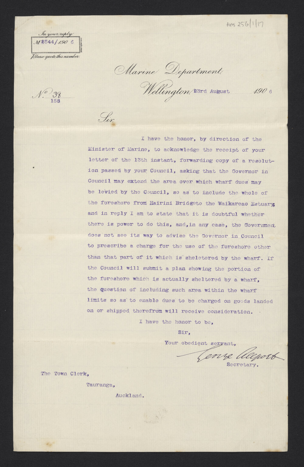 Letter from Marine Department, Wellington to the Town Clerk, Tauranga, 23 Aug 1905 (23 August 1906). Pae Korokī, accessed 02/04/2026, https://paekoroki.tauranga.govt.nz/nodes/view/95221