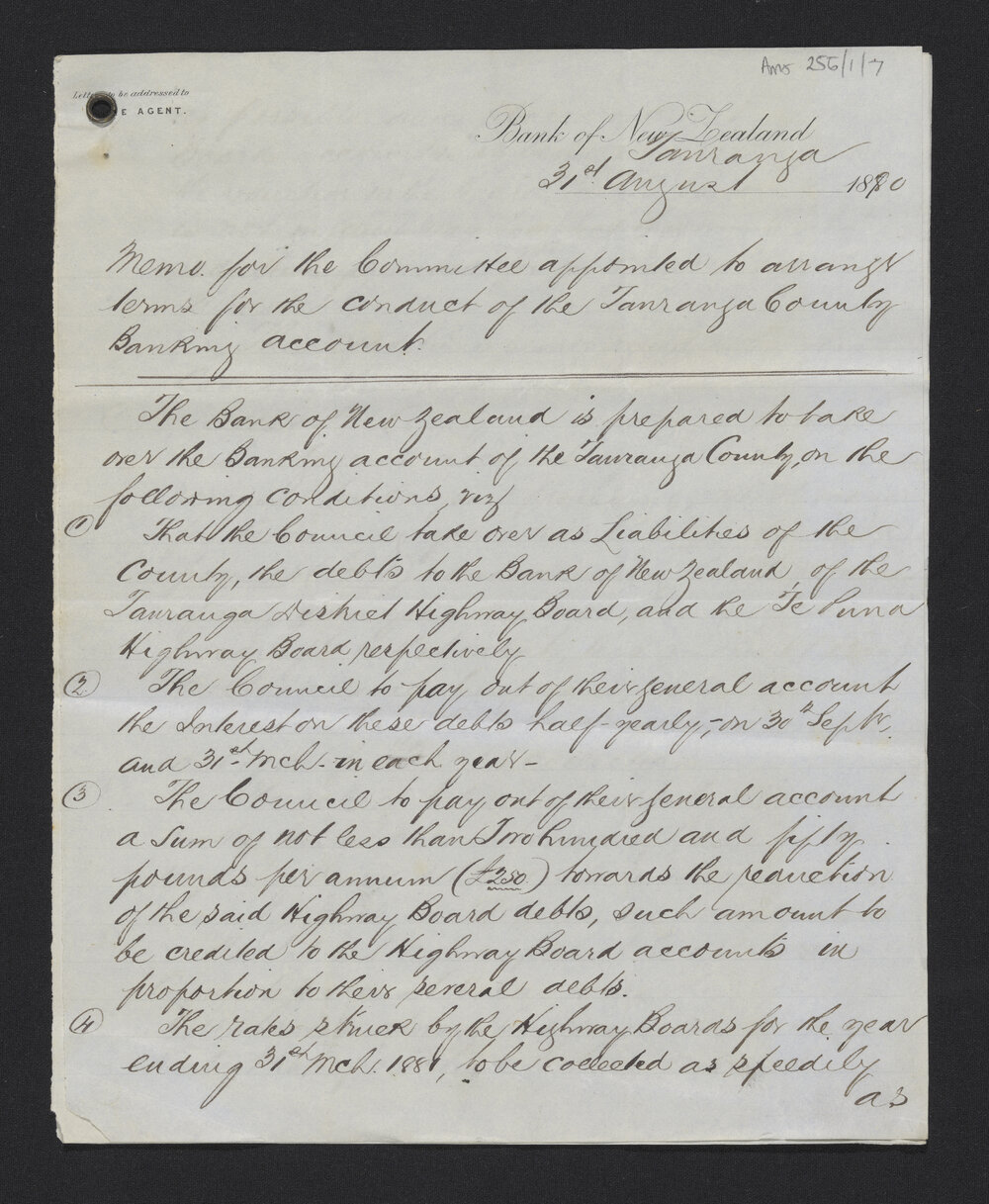 Memo for the Committee arranging the Tauranga County banking account, 1880