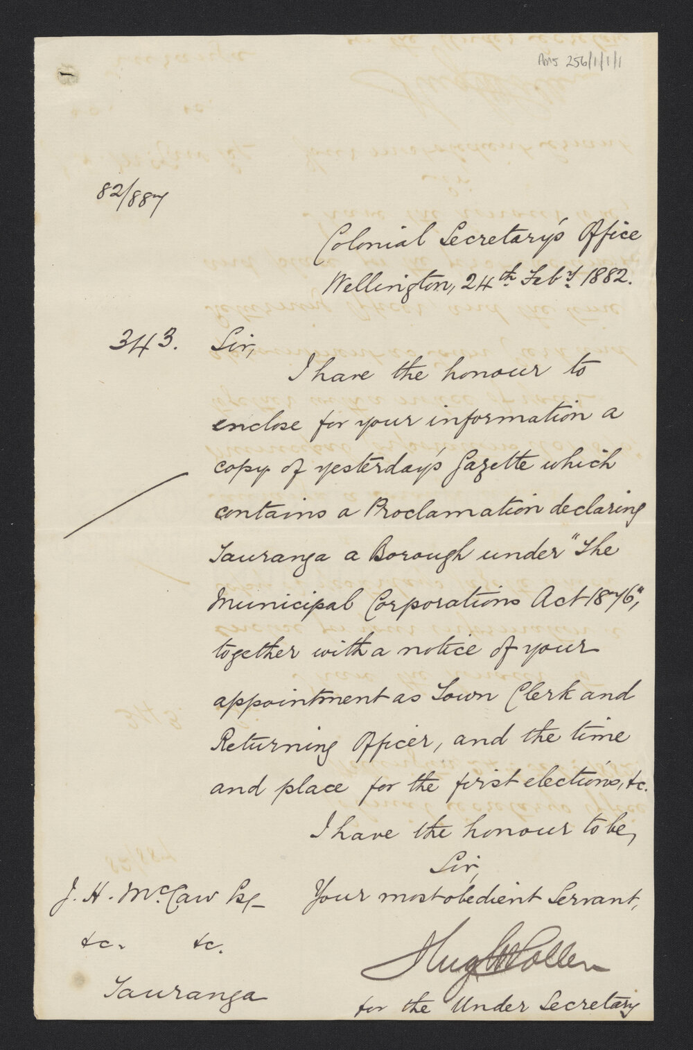 Tauranga Borough Council, Letter from Colonial Secretary's Office to J.H. McCaw, 24 Feb 1882 (24 February 1882). Pae Korokī, accessed 02/04/2026, https://paekoroki.tauranga.govt.nz/nodes/view/95243