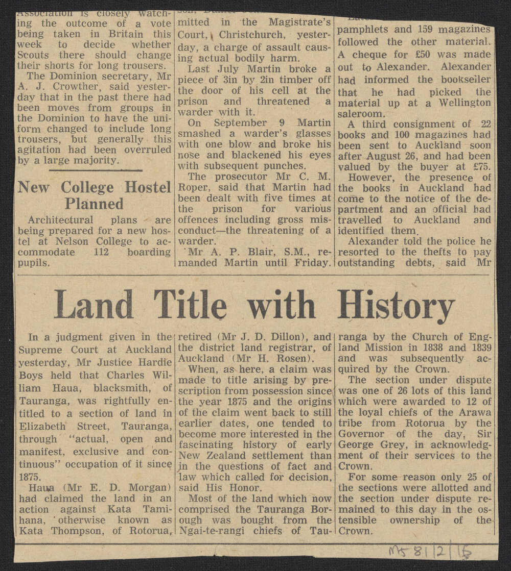 Newspaper clipping 'Land title with history', September 1960 (September 1960). Pae Korokī, accessed 25/03/2026, https://paekoroki.tauranga.govt.nz/nodes/view/95244