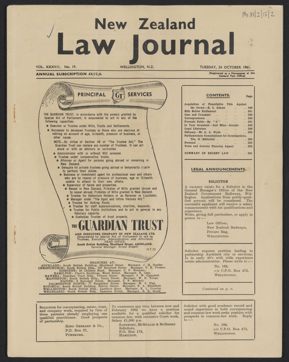 New Zealand Law Journal, Vol. XXXVII No. 19, 24 October 1961