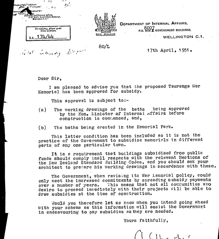 In 1947, the central government formally put out a suggestion that local governments, including that of Tauranga, considered too good an offer to refuse. Here's a letter from the Department of Internal Affairs to the Town Clerk (a position akin to the current Chief Executive of the council).