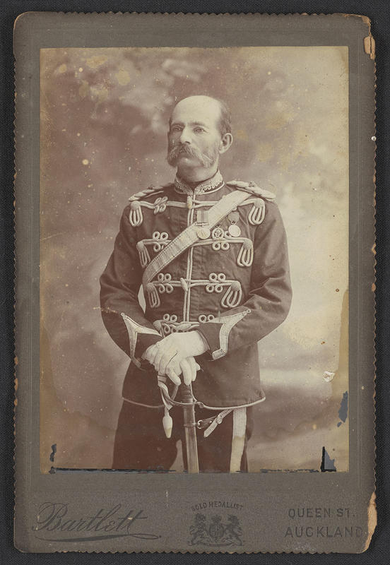 Description A photograph of Colonel Arthur Morrow in military uniform, his hands rest on a sword. Photograph by R. H. Bartlett Auckland.