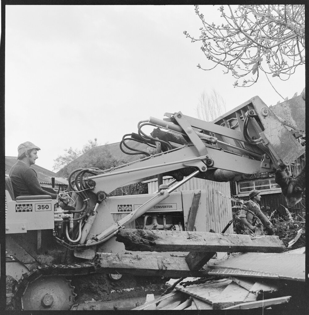 Date25 September 1975Reference Numberphoto gca-22342DescriptionAn old fig tree and a block of offices and shops are demolished on the corner of Seddon and Haszard Streets to make way for a new Bank of New Zealand premises in Waihī. Published 25 September 1975.Physical Description120-format cellulose triacetate black and white negative (5/6)Photographer/CreatorBay of Plenty Times