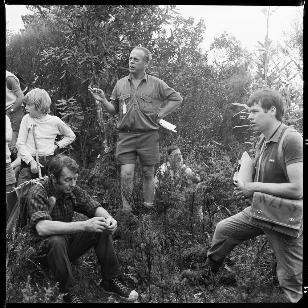 Date8 November 1975Reference Numberphoto gca-22385DescriptionMr Gavin Molloy, Conservator of Forests, Auckland speaks about methods of Kauri enrichment. At right is Mr John Halkett, one of the two scientists engaged in Kauri management, Mr Don Roberts, a Kaimai settler is to the left and behind him is his son Tony. Published 8 November 1975.Physical Description120-format cellulose triacetate black and white negative (1/2)Photographer/CreatorBay of Plenty Times