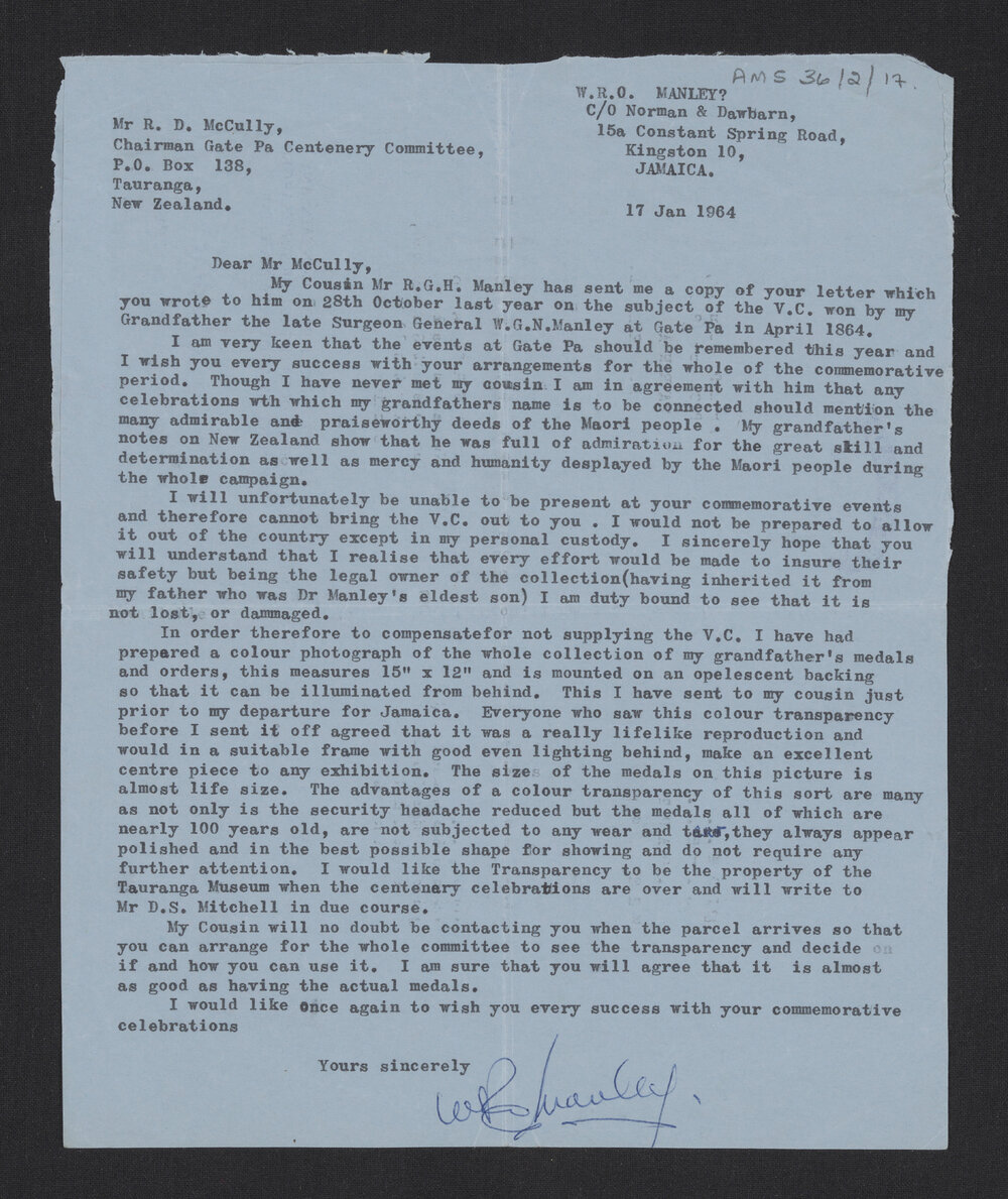 W.R.O. Manley, Inward correspondence from W.R.O. Manley of Jamaica (11 January 1964). Pae Korokī, accessed 02/04/2026, https://paekoroki.tauranga.govt.nz/nodes/view/96811