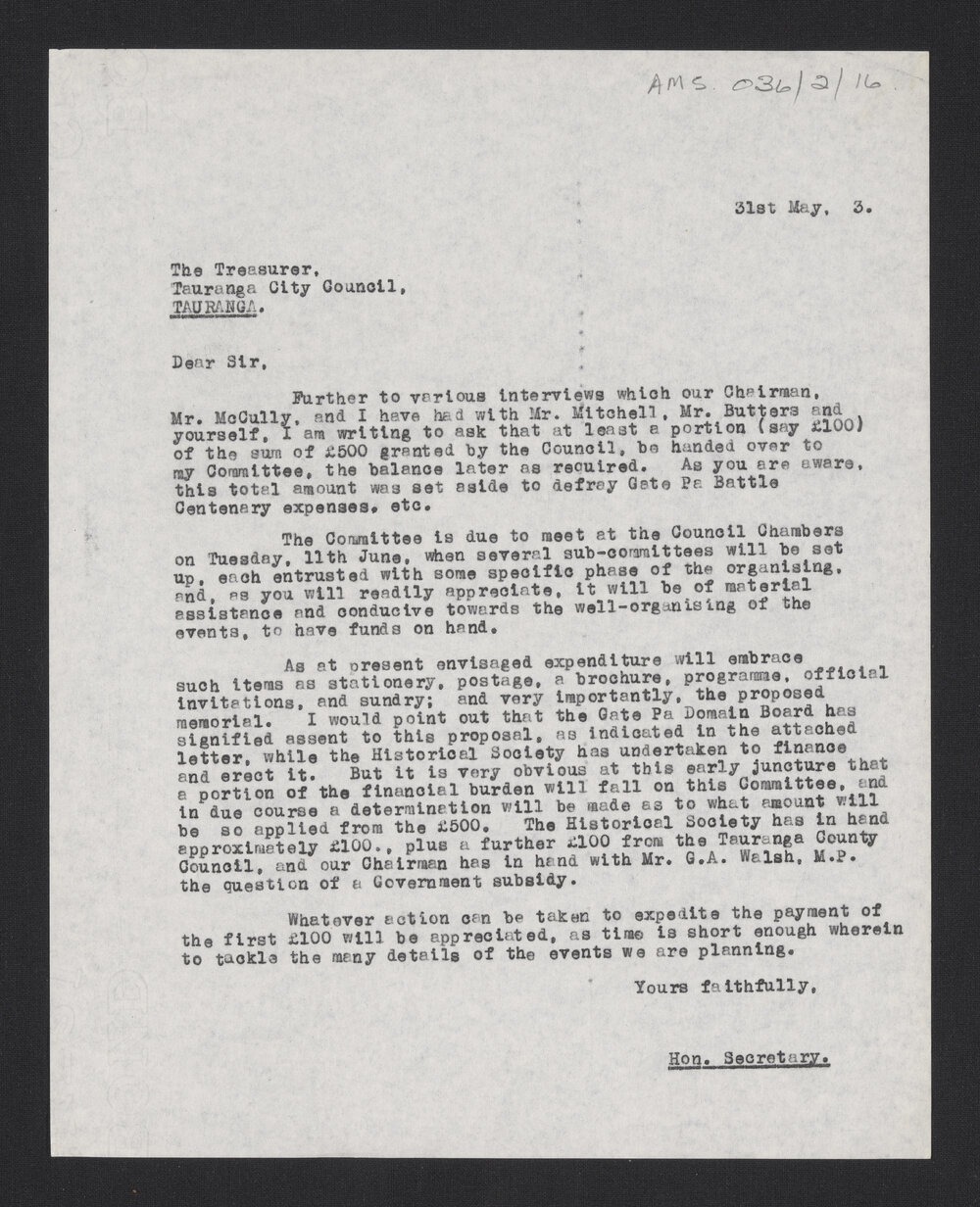Gate Pā Centenary Committee, Letter to The Treasurer, Tauranga City Council (31 May 1963). Pae Korokī, accessed 02/04/2026, https://paekoroki.tauranga.govt.nz/nodes/view/96812