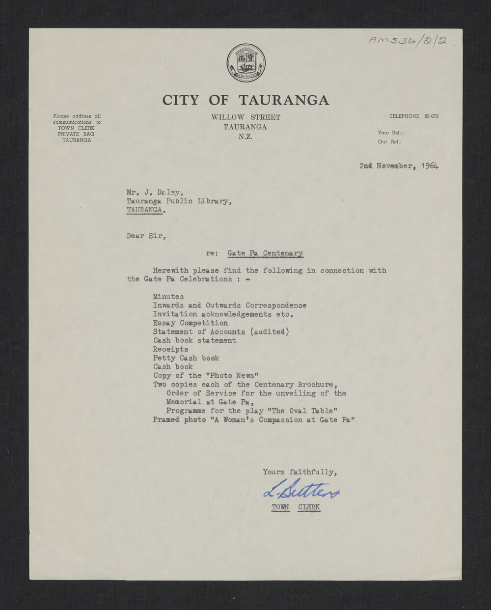 Tauranga Borough Council , Letter to Mr J. Daley at Tauranga Public Library (2 November 1964). Pae Korokī, accessed 02/04/2026, https://paekoroki.tauranga.govt.nz/nodes/view/96826