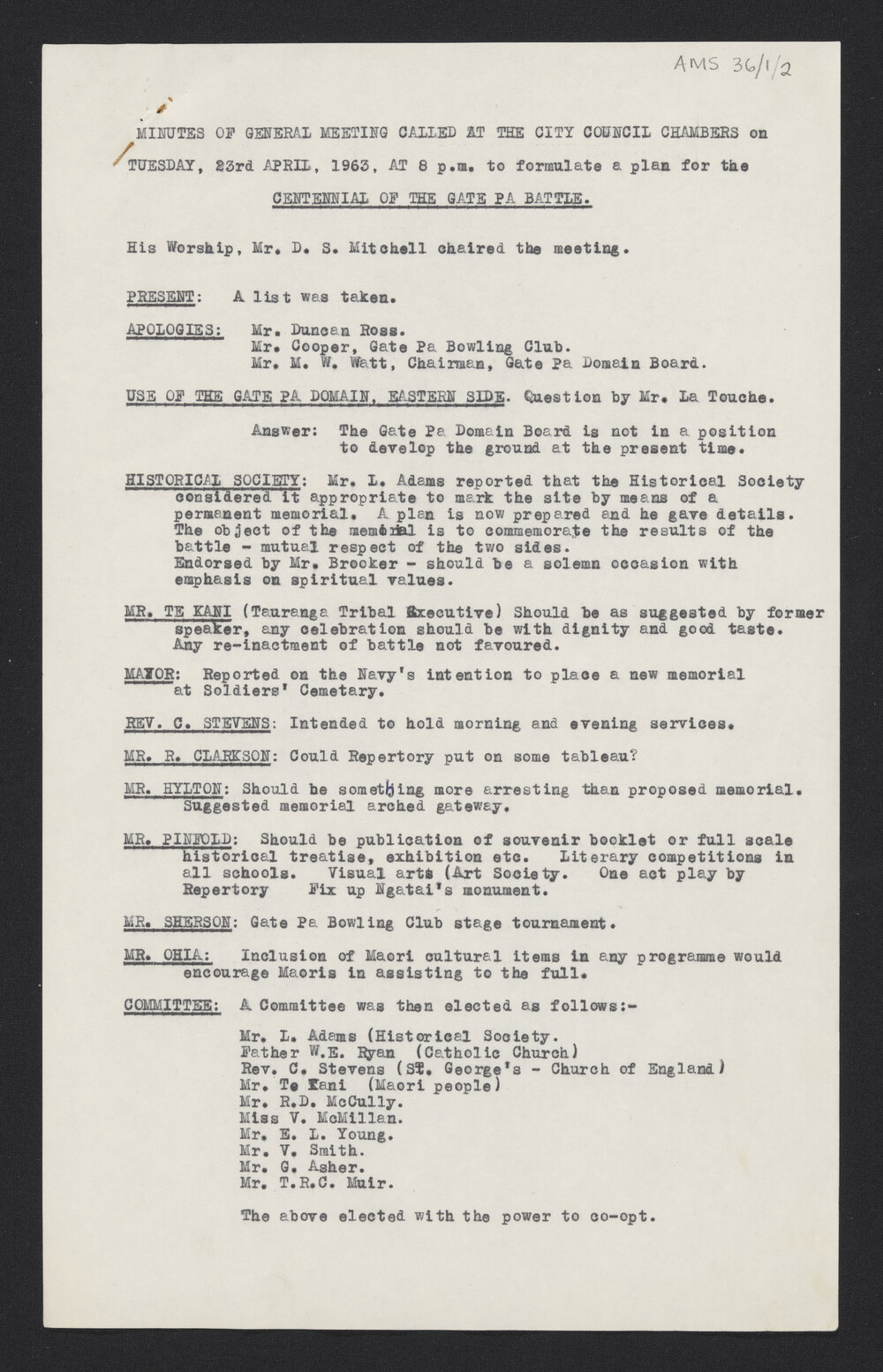 Gate Pā Centenary Committee, Minutes of meeting on 23 April 1963 (23 April 1963). Pae Korokī, accessed 02/04/2026, https://paekoroki.tauranga.govt.nz/nodes/view/96845