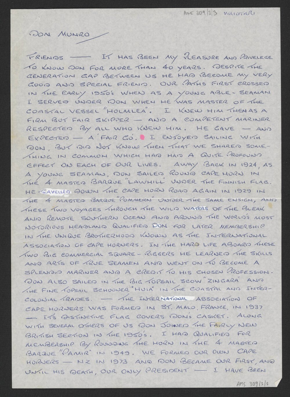 Tribute letter from Murray Henderson spoken during the Funeral Service of Don Munro, 16 Aug 1995
