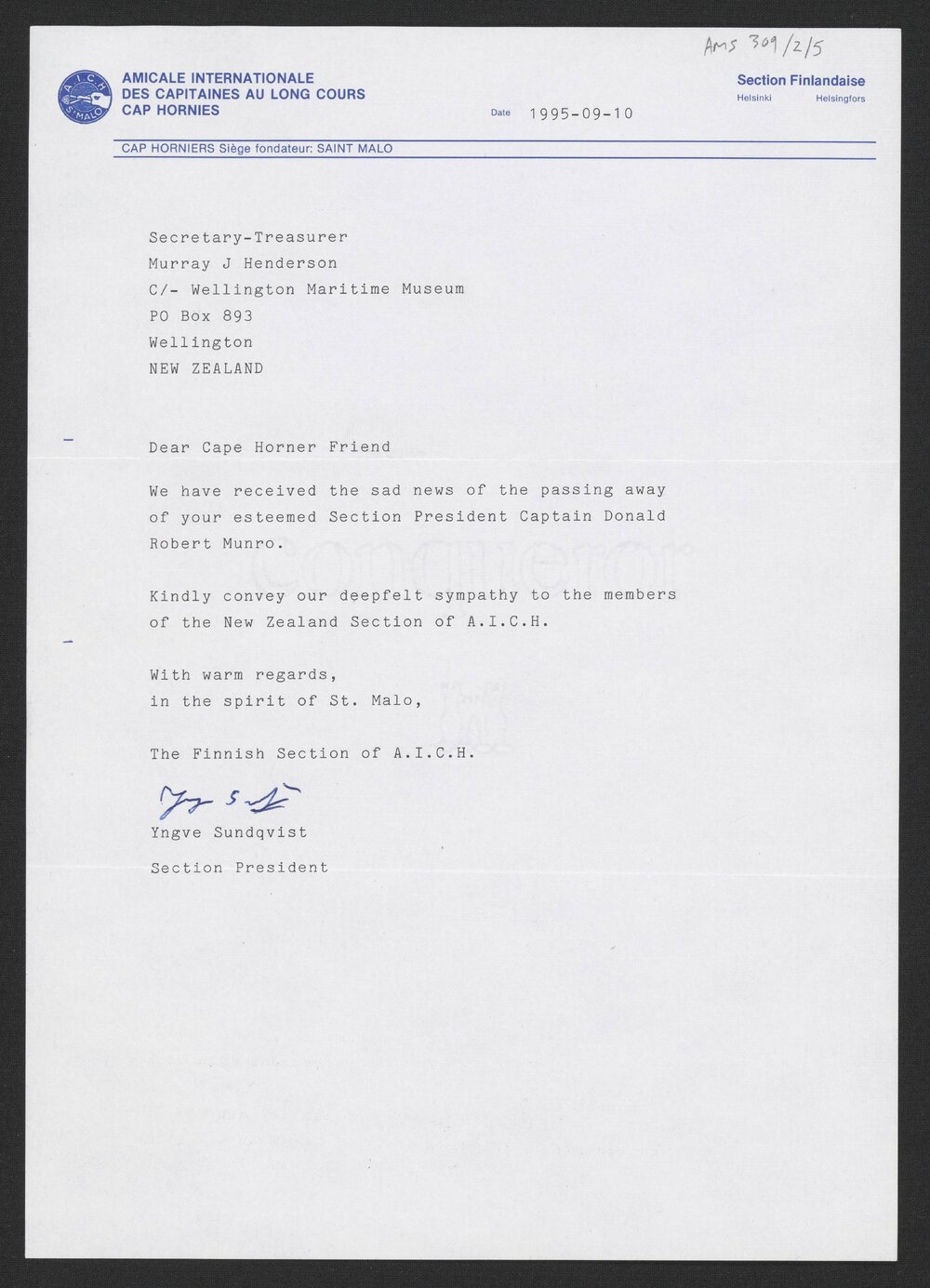 Amicale Internationale Des Capitanes Au Long Cours Cap Horniers. Finlandaise, Letter from The Finnish Section Cape Horn Foundation to Murray J Henderson, 10 Sep 1995 (10 September 1995). Pae Korokī, accessed 19/03/2026, https://paekoroki.tauranga.govt.nz/nodes/view/97875