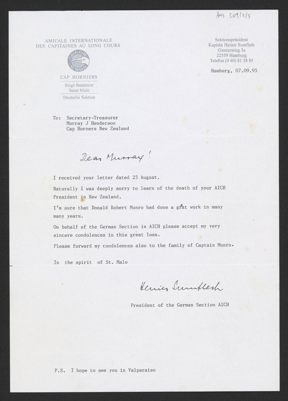 Amicale Internationale Des Capitanes Au Long Cours Cap Horniers. Deutsche, Letter from the German Section A.I.C.H to Murray J Henderson, 7 Sep 1995 (7 September 1995). Pae Korokī, accessed 19/03/2026, https://paekoroki.tauranga.govt.nz/nodes/view/97877