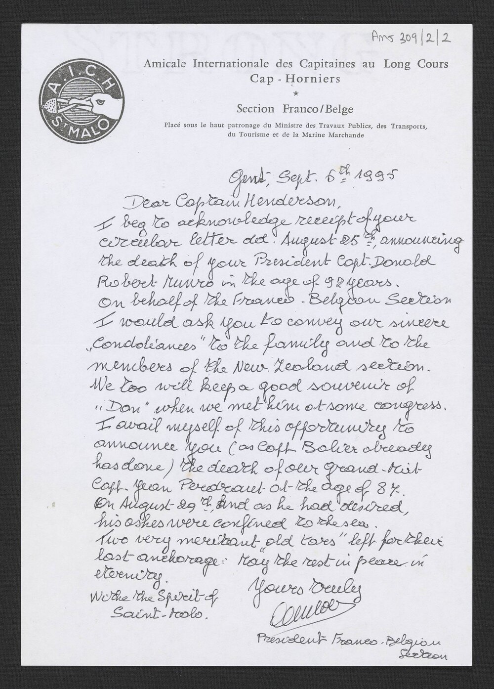 Amicale Internationale Des Capitanes Au Long Cours Cap Horniers. Franco/Belge, Letter from the French/Belgian Section A.I.C.H to Captain Henderson, 6 Sep 1995 (6 September 1995). Pae Korokī, accessed 19/03/2026, https://paekoroki.tauranga.govt.nz/nodes/view/97878
