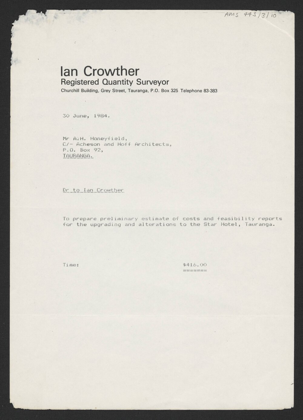 Ian Crowther, Registered Quantity Surveyer, Invoice from Ian Crowther to A. H. Honeyfield, June 1984 (30th of June 1984). Pae Korokī, accessed 24/03/2026, https://paekoroki.tauranga.govt.nz/nodes/view/98646