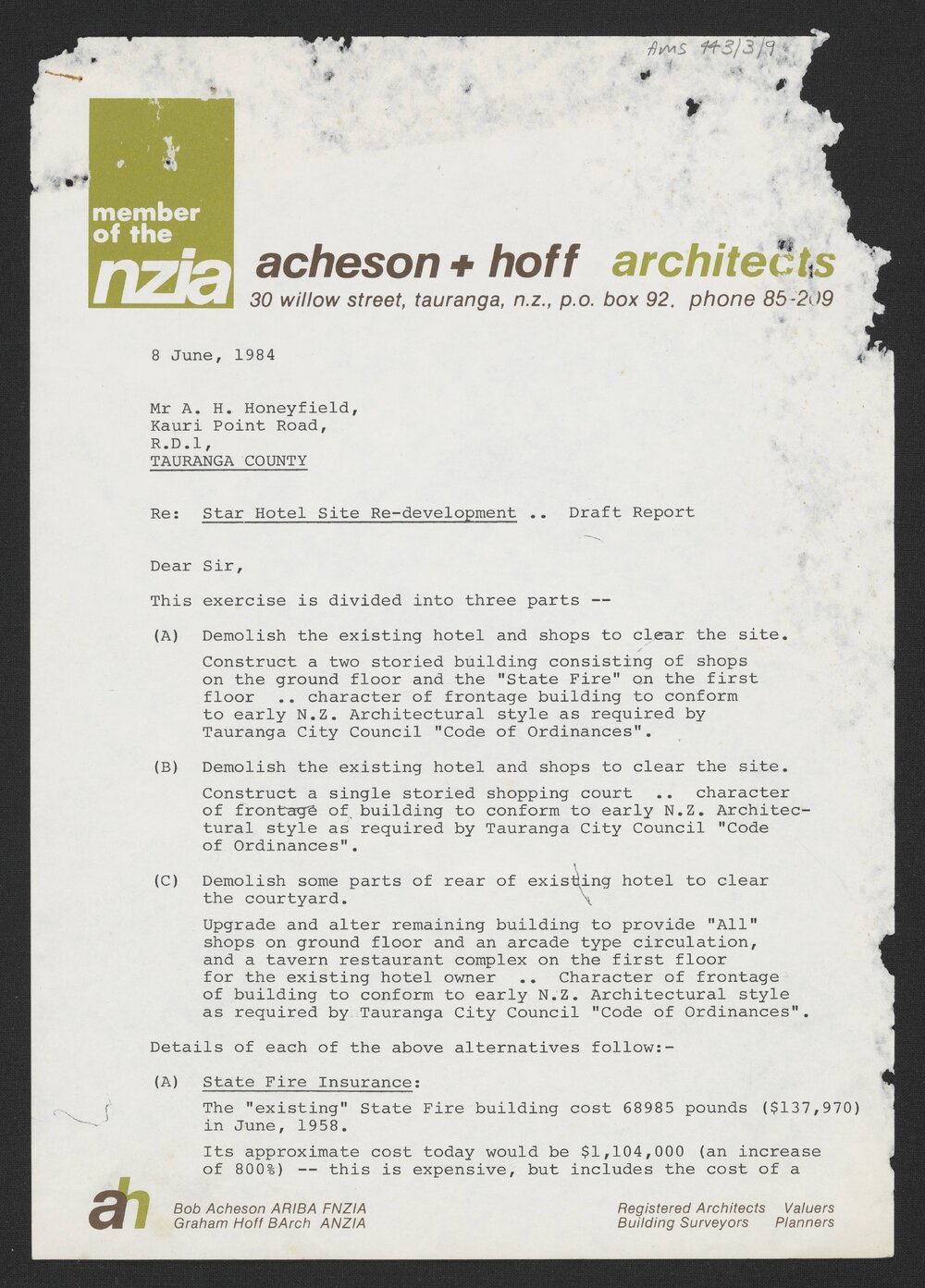 Acheson & Hoff Architects, Letter re: Star Hotel Site Re-development Draft Report, June 1984. (8th of June 1984). Pae Korokī, accessed 24/03/2026, https://paekoroki.tauranga.govt.nz/nodes/view/98647