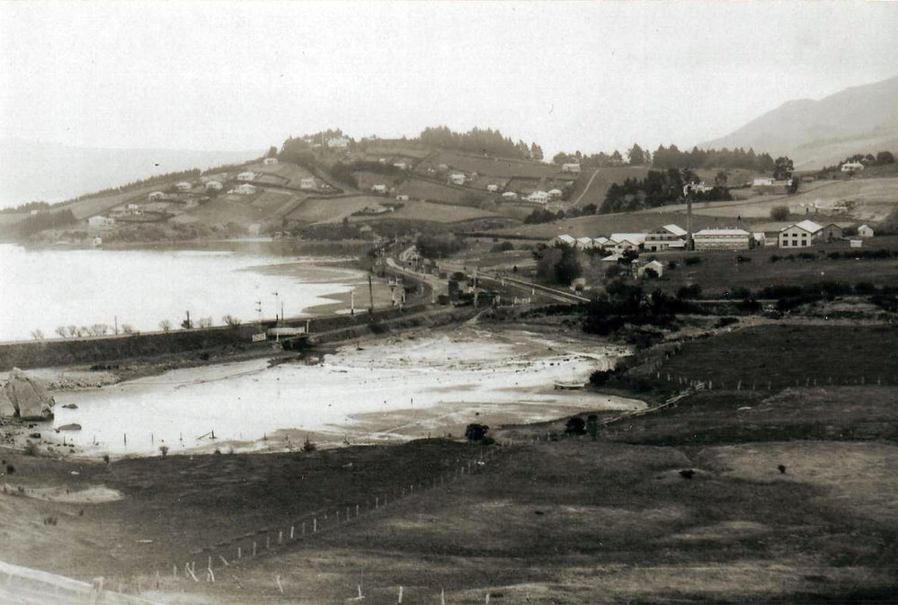 1. Pratley. Pic1. Caption as follows: Sawyer”s Bay taken from the Port Hill showing school, Laing”s Bush and market gardens above. (Circa 1917)