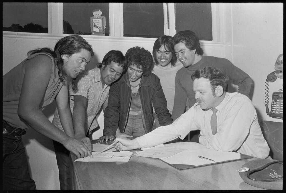 Date29 January 1974Reference Numberphoto gcc-24457DescriptionFour members of the Tarawa family decided to join the New Zealand Territorials. Pictured from left is Vaughan, Brigham, Mathew, family friend Dale Nepia and Logan with Staff Sergeant D. Young of 6NZIR (Hauraki). Published 29 January 1974.Physical Description35mm black-and-white negative (2/3)Photographer/CreatorBay of Plenty Times